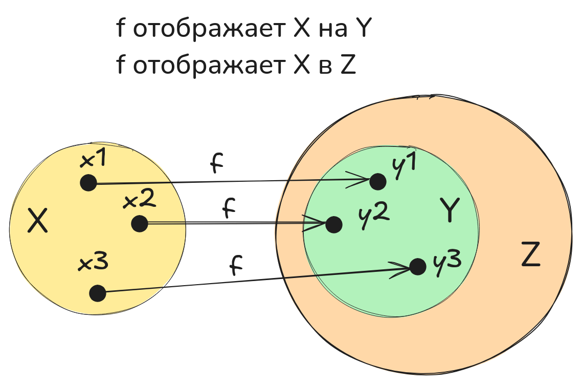 Говорят, что функция f отображает множество X на множество Y, если является подмножеством области определения , а образом при отображении посредством является множество .