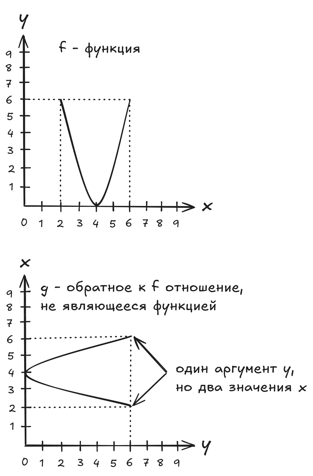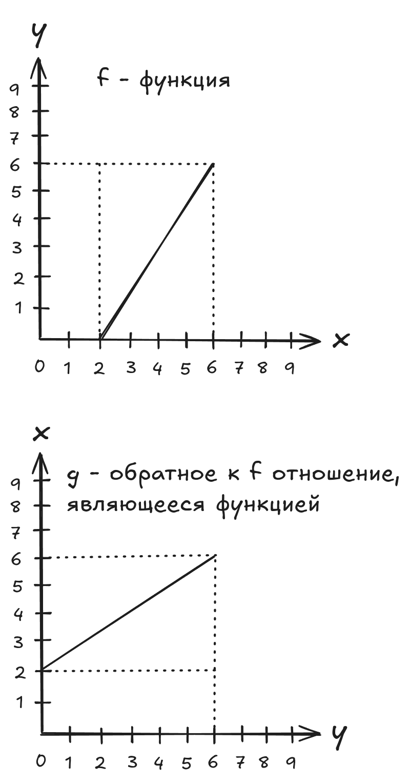 Из иллюстраций ниже следует, что функция является взаимно однозначной тогда и только тогда, когда обратное отношение тоже является функцией. Иными словами, обратные функции бывают только у взаимно однозначных функций.